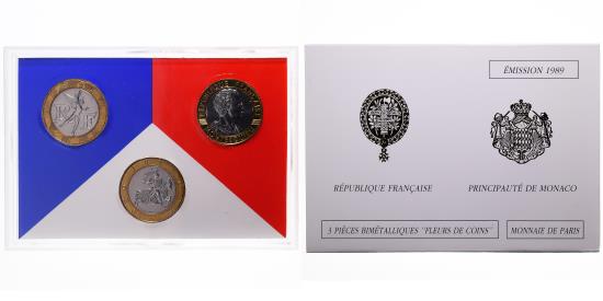 | | Coin, France, Coffret triptyque 3 x 10 frs., 1989, MDP, FDC, 623/2000 | | | Rare proof set, struck by the Monnaie de Paris. Contains: 10 francs Génie de la Bastille, 10 francs Montesquieu and 10 francs Rainier III Monaco. | | FEATURES |