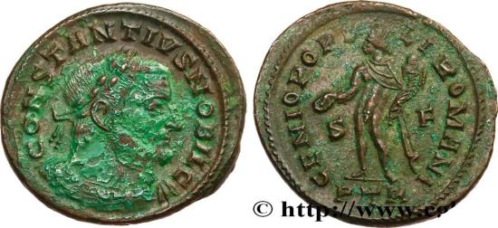 CONSTANTIUS I Caesar Follis ou nummus 296-297 Trèves copper Obverse : CONSTANTIVS NOBIL C Buste lauré et cuirassé de Constance Ier césar à droite drapé sur l’épaule, vu de trois quarts en avant (B*01) Reverse : GENIO POPV-LI ROMANI/ S|F// PTR Genius (le Génie) debout à gauche nu, tourelé, le manteau sur lépaule, tenant de la main gauche une corne dabondance et de la main droite une patère Pedigree : Exemplaire de la collection Aymé Cornu Commentary : Flan large, ovale, centré. Joli revers. Métal taché. Patine grise
