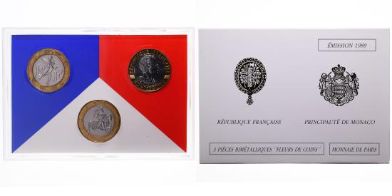 | | Coin, France, Coffret triptyque 3 x 10 frs., 1989, MDP, FDC, 356/2000 | | | Rare proof set, struck by the Monnaie de Paris. Contains: 10 francs Génie de la Bastille, 10 francs Montesquieu and 10 francs Rainier III Monaco. | | FEATURES |