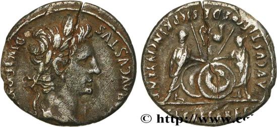 AUGUSTUS, CAIUS and LUCIUS Denier 2 AC. - AD. 12 Lyon silver Obverse : CAESAR AVGVSTVS - DIVI F PATER PATRIAE Tête laurée dAuguste à droite (O*) Reverse : C. L. CAESARES à lexergue/ AVGVSTI F COS DESIG PRINC IVVENT Caius et Lucius Césars debout de face, vêtus de la toge, tenant chacun un bouclier rond et une haste ; entre eux, lituus à gauche, le simpulum à droite Commentary : Monnaie centrée, fissurée à 1h. Joli portrait. Patine grise
