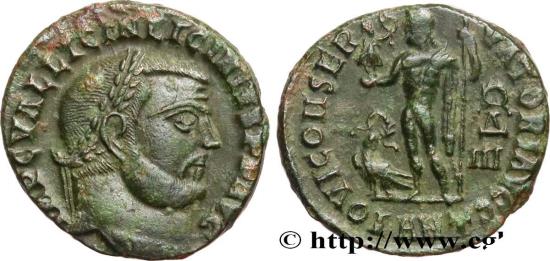 Commentary : Monnaie centrée frappée sur un flan court, avec une jolie tête de l’empereur Licinius Ier au droit. Patine verte