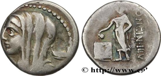 Anépigraphe Tête voilée de Vesta à gauche ; derrière, la kylix ou le cymbium (coupe à deux anses à boire) et devant, marque de contrôle I