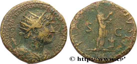HADRIAN Dupondius 123 Rome R1 copper Obverse : IMP CAESAR TRAIAN HADRIANVS AVG P M TR P COS III Buste radié et drapé d’Hadrien à droite, vu de trois quarts en avant (A01) Reverse : PIETAS - AVGVSTI/ S|C Pietas (la Piété) drapée, debout à droite, levant la main droite, tenant une boite à encens de la main gauche, un autel à ses pieds Commentary : Monnaie légèrement décentrée frappée sur un flan court, avec un joli buste. Patine marron