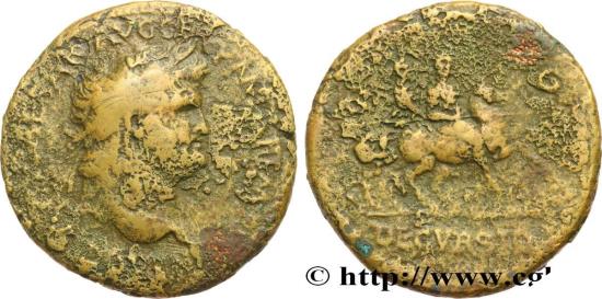 NERO Sesterce 64 Rome R2 copper Obverse : NERO CLAVD CAESAR AVG GERM P M TR P IMP P P Buste lauré de Néron à droite avec l’égide sur l’épaule droite (O*4) Reverse : S|C// DECVRSIO Néron en habit militaire, tenant horizontalement une haste de la main droite, sur un cheval qui galope à droite ; au second plan, un soldat, en retrait, sur un cheval qui galope à droite, portant un vexillum sur l’épaule Pedigree : Exemplaire provenant de la collection J. H Commentary : Flan large, centré. Métal piqué. Revers agréable. Patine marron