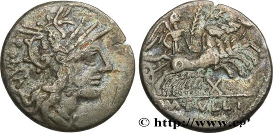 M. TVLLI Victoria (la Victoire) dans un quadrige galopant à droite, tenant les rênes et une palme de la main gauche ; dans le champ au-dessus des chevaux, une couronne ; sous le quadrige, X