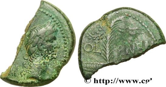IMP// DIVI F Têtes opposées dAgrippa à gauche et dAuguste à droite La tête dAgrippa est coiffée dune couronne rostrale laurée, celle dAuguste est seulement laurée