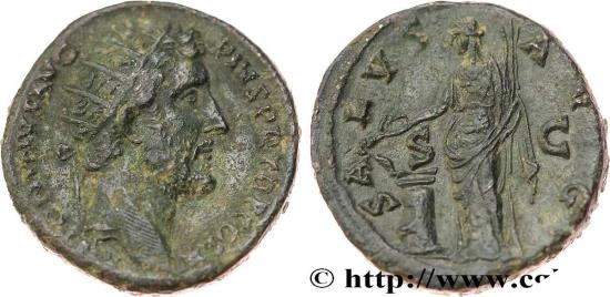 SA-LVS - AVG/ S|C Salus (La Santé) debout de face tournée à gauche, tenant un sceptre long de la main gauche et une patère de la main gauche et nourrissant un serpent enroulé autour dun autel.