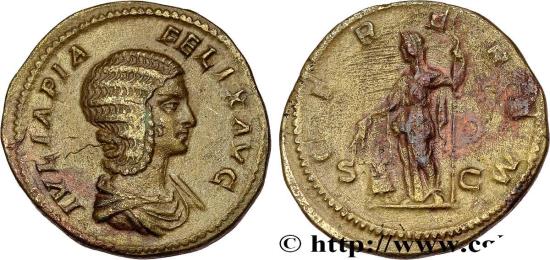 JULIA DOMNA Augusta Dupondius 212 Rome R1 bronze Obverse : IVLIA PIA - FELIX AVG Buste drapé de Julia Domna à droite, vu de trois quarts en avant, la chevelure en tresses, ramenées derrière la tête (L) Reverse : CERE-REM/ S|C Cérès debout à gauche, tenant deux épis dans la main droite au dessus du modius et un sceptre de la main gauche Commentary : Flan large, mince, centré. Très joli buste de Julia Domna. Fine usure régulière. Patine marron
