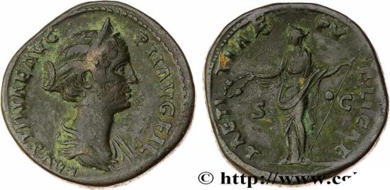 FAUSTINA MINOR Augusta Sesterce 148-152 Rome R1 copper Obverse : FAVSTINAE AVG - PII AVG FIL Buste drapé de Faustine Jeune à droite, avec les cheveux relevés coiffés en chignon (L) Reverse : LAETITIAE - PV-BLICAE/ S|C Laetitia (la Joie) drapée, debout de face, regardant à gauche, tenant une couronne de la main droite et un sceptre transversal de la gauche Commentary : Monnaie idéalement centrée, avec de très jolis détails au droit comme au revers. Légendes lisibles dans leur intégralité. Une belle patine marron