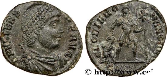 VALENS Nummus, (PB, Æ 3) 367 Constantinople copper Obverse : D N VALENS - P F AVG Buste diadémé de Valens à droite, avec cuirasse et paludamentum, vu de trois quarts en avant (Aa) Reverse : GLORIA RO-MANORVM// CONSP[...] Valens debout à droite, vêtu militairement, tenant le labarum chrismé de la main gauche et de la main droite les cheveux dun captif agenouillé Commentary : Monnaie frappée sur un flan ovale, très joli buste au droit. Belle patine verte