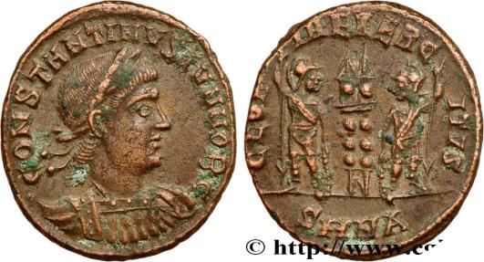 CONSTANTINE II Caesar Centenionalis ou nummus 336-337 Nicomédie R1 copper Obverse : CONSTANTINVS IVN NOB C Buste lauré et cuirassé de Constantin II à droite drapé sur l’épaule, vu de trois quarts en avant (B*01) Reverse : GLOR-IA EXERC-ITVS/ -|-// SMNA Deux soldats debout, casqués, tenant chacun une haste et appuyés sur un bouclier ; entre eux, deux enseignes militaires Commentary : Monnaie bien centrée, avec de très jolis détails. Belle patine marron