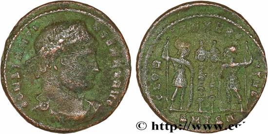 CONSTANTINE I THE GREAT Augustus Centenionalis ou nummus 330-333 Thessalonique copper Obverse : CONSTANTI-NVS MAX AVG Buste diadémé, drapé et cuirassé de Constantin Ier à droite, vu de trois quarts en avant (Ac) ; diadème perlé et gemmé Reverse : GLOR-IA EXERC-ITVS// SMTSA Deux soldats debout face à face, vêtus militairement, tenant chacun une haste renversée et un bouclier ; au milieu, deux étendards Commentary : Monnaie légèrement décentrée, avec un joli revers. Patine marron