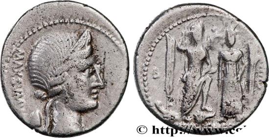 EGNATIA Denier 75 AC. Rome R2 silver Obverse : MAXSVMVS Buste diadémé et drapé de Libertas (la Liberté) à droite, portant boucles doreille et collier ; derrière, un bonnet de liberté Reverse : C. EGN(AT)IVS CN./ F./ CN. N Rome casquée debout de face tenant une haste de la main droite et posant le pied droit sur une tête de loup ; à sa droite, Vénus diadémée debout de face tenant une haste de la main droite, Cupidon sur son épaule ; de chaque côté une proue de navire surmontée dune rame ; dans le champ à gauche, marque de contrôle F Commentary : Exemplaire légèrement décentré. Joli buste de Libertas. Usure régulière. Patine grise