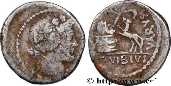 C. VIBIVS// VARVS Panthère bondissant à gauche sur un autel enguirlandé sur lequel repose un masque de Bacchus ; derrière un thyrse décoré posé transversalement
