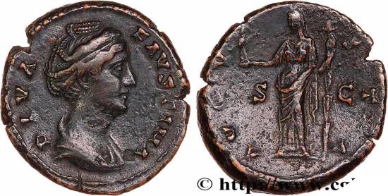 Commentary : Monnaie sur un flan centré, éclaté à 3h et 11h. Joli buste de Faustine. Patine foncée