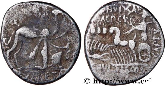 P. HVPSAE// AED CVR// C HVPSAE COS PREIVE// CAPTV Jupiter dans un quadrige galopant à gauche, brandissant un foudre de la main droite et tenant les rênes de la gauche ; sous les chevaux, un scorpion