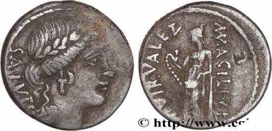 MN ACILIVS/ III VIR VALETV Valetudo (la Santé) debout à gauche, appuyée sur une colonne de la main gauche et tenant un serpent de la main droite