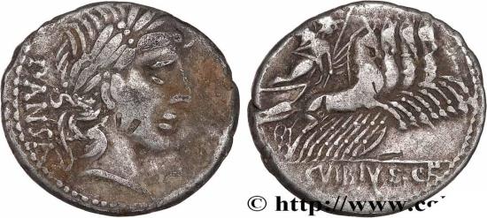 VIBIA Denier 90 AC. Rome silver Obverse : PANSA Tête laurée dApollon à droite, les cheveux courts ; devant, symbole indéterminé (?) Reverse : C. VIBIVS. C. F. à lexergue Minerve debout dans un quadrige galopant à droite, casquée, tenant de la main droite un trophée et une longue javeline et les rênes de la main gauche Commentary : Exemplaire sur un flan ovale, centré. Joli revers. Patine grise, tachée au droit