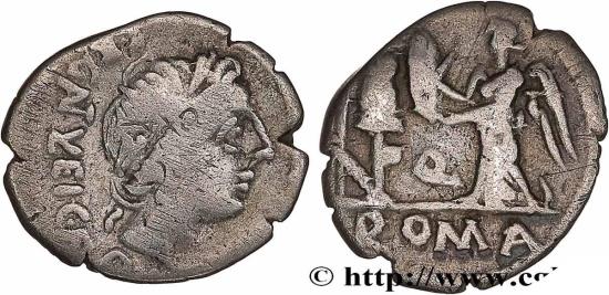 EGNATULEIA Quinaire 97 AC. Rome silver Obverse : C. EG(NAT)(VL)EI C. F. Q Tête laurée d’Apollon à droite Reverse : ROMA à l’exergue, au-dessus Q Victoire drapée debout à droite, tournée à gauche, posant un bouclier sur un trophée d’armes placé dans le champ à gauche, derrière une longue javeline et un carnyx Commentary : Flan ovale, centré. Usure régulière. Joli revers. Patine grise