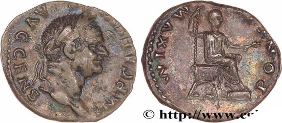 PONTIF - MAXIM Vespasien assis à droite, tenant un sceptre de la main droite et une branche de laurier de la gauche