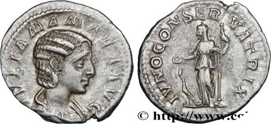 JULIA MAMAEA Daughter of Julia Maesa, mother of Severus Alexander - Augusta Denier 222 Rome silver Obverse : IVLIA MAMAEA AVG Buste drapé de Julia Mamée à droite, vu de trois quarts en avant (L) Reverse : IVNO CONSER-VATRIX Junon voilée debout à gauche, tenant une patère de la main droite et un sceptre de la gauche ; à ses pieds à gauche, un paon, tournant la tête à droite Commentary : Monnaie sur un flan large, centré. Très beau buste de Julia Mamée. Patine grise avec de légers reflets dorés