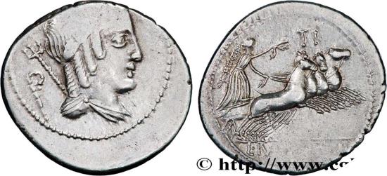 JULIA Denier 85 AC. Rome silver Obverse : Anépigraphe Buste drapé d’une divinité ternaire à droite (Véjovis ?) : Genius (Génie), lauré pour Apollon, ailé pour Mercure avec un trident sur l’épaule pour Neptune ; derrière le buste, un symbole Reverse : L. IVLI. BVRSIO à l’exergue Victoire dans un quadrige galopant à droite, brandissant une couronne de la main droite et tenant les rênes de la main gauche ; marque de contrôle au-dessus Commentary : Flan large, légèrement décentré au droit. Très joli revers, finement détaillé. Patine grise