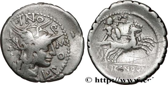 POMPONIA Denier serratus 118 AC. Narbonne R1 silver Obverse : L. POM-P-ONI. C (NF) Tête casquée de Rome à droite ; derrière la tête, marque de valeur, (X) Reverse : L. LIC. CN. DOM à lexergue Bige galopant à droite, conduit par Bituit, brandissant une lance de la main droite, et tenant un bouclier, le carnyx et les rênes de la main gauche Commentary : Flan large, légèrement décentré au droit. Revers agréable. Patine grise