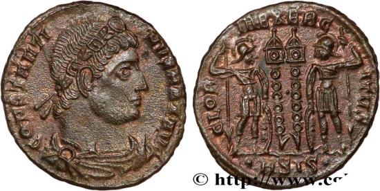 CONSTANTINE I THE GREAT Augustus Centenionalis ou nummus 334-335 Siscia copper Obverse : CONSTANTI-NVS MAX AVG Buste diadémé, drapé et cuirassé de Constantin Ier à droite, vu de trois quarts en avant (A’b) ; diadème lauré et gemmé Reverse : GLOR-IA EXERC-ITVS/ -|-// .ASIS. Deux soldats debout face à face, vêtus militairement, tenant chacun une haste renversée et un bouclier au milieu, deux étendards Commentary : Magnifique exemplaire sur un flan idéalement centré. Revers fantastique, finement détaillé. Patine marron avec des reflets cuivrés