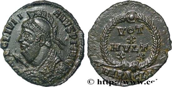 JULIAN II THE PHILOSOPHER Augustus Maiorina ou nummus 362-363 Héraclée copper Obverse : D N FL CL IVLI-ANVS P F AVG Buste barbu, diadémé, casqué, drapé et cuirassé de Julien II auguste à gauche, vu de trois quarts en avant, tenant la lance de la main droite et le bouclier de la gauche (C4) ; diadème perlé Reverse : VOT/ X/ MVLT/ XX/ -|-// HERACLA Légende en quatre lignes dans une couronne Commentary : Exemplaire centré. Très beau buste de Julien II. Patine foncée