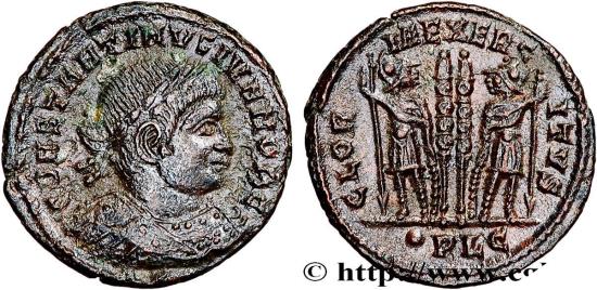 GLOR-IA EXERC-ITVS/ -|-// .PLG Deux soldats, vêtus militairement, tenant chacun une haste renversée de la main droite et un bouclier de la main gauche, debout face à face ; au milieu deux enseignes militaires