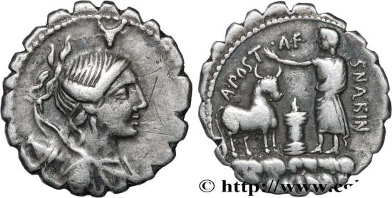 POSTUMIA Denier serratus 81 AC. Rome R1 silver Obverse : Anépigraphe Buste drapé de Diane à droite avec l’arc et le carquois sur l’épaule ; au-dessus de la tête, un bucrane vu de face Reverse : A. POST. - A. F. / S. N. (AL)BIN verticalement Romain debout à gauche sur un rocher, vêtu de la toge (adlocutio), devant un bœuf debout à droite, placé devant un autel paré et allumé Commentary : Monnaie idéalement centrée. Joli buste de Diane. Revers agréable, bien venu à la frappe. Patine grise