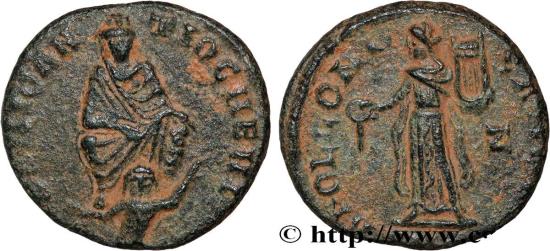 ANTIOCHIA Demi-follis ou demi-nummus 311-312 Antioche R1 copper Obverse : GENIO AN-TIOCHENI La Tyche d’Antioche vue de face, tourelée, drapée assise sur un rocher ; à ses pieds, L’Oronte, nageant à droite, tournant la tête à gauche Reverse : APOLLONI - SANCTO/ -|Z/ SMA Apollon debout de face, tourné à gauche, vêtu du chiton et du peplos, tenant une patère de la main droite et une lyre de la main gauche Commentary : Monnaie idéalement centrée. Joli revers. Patine marron