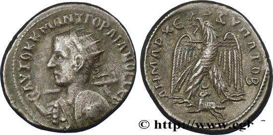 GORDIAN III Augustus Tétradrachme syro-phénicien 242 Antioche, Syrie, Séleucie et Piérie R1 billon Obverse : Buste radié et cuirassé de Gordien III à gauche, tenant un bouclier à tête de Méduse centrale (serpents des cheveux nets) à gauche et un bâton de commandement posé sur l’épaule à droite, les rubans de la couronne de laurier flottant derrière la tête, vu de trois-quarts avant. On aperçoit quelques écailles de la cuirasse, la ptéryge de droite et un baudrier, sans pouvoir dire si ce baudrier tient le gladius ou le bouclier Reverse : Aigle debout à droite, la tête et la queue à gauche, les ailes déployées, tenant une couronne feuillue de lauriers dans son bec, entre ses pattes, un bélier courant à gauche, tête à droite, sous un croissant de lune Pedigree : Cet exemplaire provient de la collection Abdo Ayoub Commentary : Exemplaire sur un flan large et ovale bien centré avec les grènetis visibles. Beau portrait inhabituel de Gordien III. Joli revers. Patine gris foncé avec des reflets métalliques