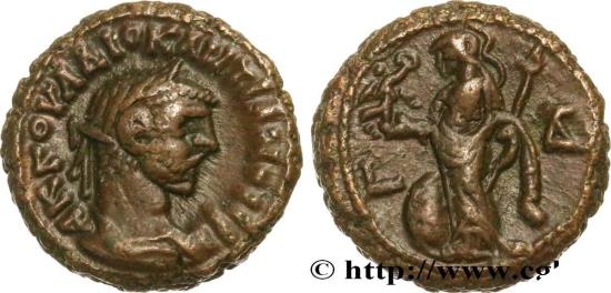 DIOCLETIAN Augustus Tétradrachme 287-288 Alexandrie, Égypte copper Obverse : Buste lauré, drapé et cuirassé de Dioclétien à droite, vu de trois quarts en arrière (A*). Reverse : L/ Athéna/Minerve casquée et drapée debout à gauche, tenant une Niké de la main droite et s’appuyant sur son bouclier de la main gauche Commentary : Exemplaire sur un petit flan bien centré. Beau buste de Dioclétien. Joli revers. Patine marron