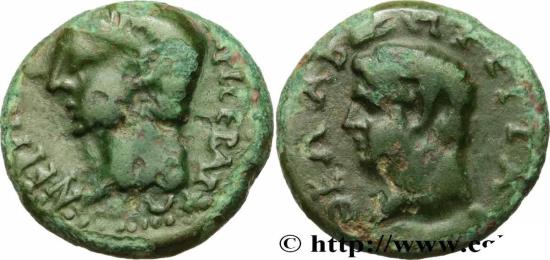 Commentary : Exemplaire sur un petit flan épais, un peu court sur les légendes. Belles têtes de Néron et d’Auguste. Patine verte, légèrement écaillée