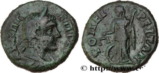 Némésis debout à gauche tenant une balance et un sceptre ; une roue à ses pieds