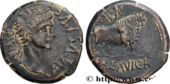 AUGUSTUS As c. 15-14 AC. Ercavica (Cuenca), Espagne, Tarraconaise R1 copper Obverse : AVGVSTVS - DIVI F Tête laurée dAuguste à droite (O*) Reverse : MVN// ERCAVICA Taureau debout à droite Commentary : Monnaie sur un flan large, légèrement décentré au revers. Joli taureau, bien détaillé. Portrait agréable. Patine foncée
