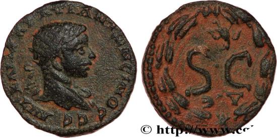 ELAGABALUS Dupondius c. 218-219 Antioche, Syrie, Séleucie et Piérie R1 copper Obverse : Tête radiée d’Élagabal à droite (O) Reverse : S. C Aigle sous les lettres ; le tout dans une couronne de laurier fermée Commentary : Exemplaire sur un flan épais et bien centré. Superbe revers, finement détaillé. Patine marron