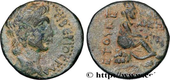 Tyche assise à droite sur des rochers tenant des épis ; devant, un dieu-rivière