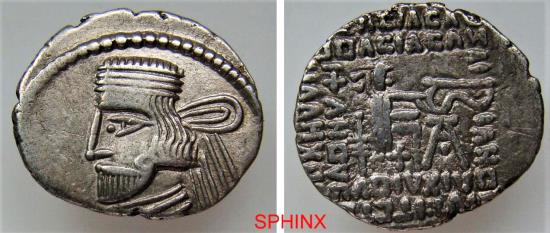 | 685GM22P) KINGS of PARTHIA. Vardanes II. Circa AD 55-58. AR Drachm (3.55 g 19 X 21.5 mm). Ekbatana mint. Diademed bust left, wearing short beard, earring, and spiral torque; all within pelleted border / (quadrate O)Λ(three-bar Σ)IΛ(three-bar Σ)Λ(three-bar Σ)/(quadrate O)Λ(three-bar Σ)IΛ(three-bar Σ)ΛN ΛI IΛK(quadrate O)Y IVIOIΓ(three-bar Σ)T(quadrate O)[V] ΔIXΛI(quadrate O)V [E]ΠI+NΛ(quadrate O)V(three-bar Σ)/[Φ]IΛIΛΛHX(quadrate O)(three-bar Σ)] (sic), archer (Arsakes I) seated right on throne, holding bow; monogram below bow. Sellwood 69.14; Shore 385-386. Good VF, toned. |