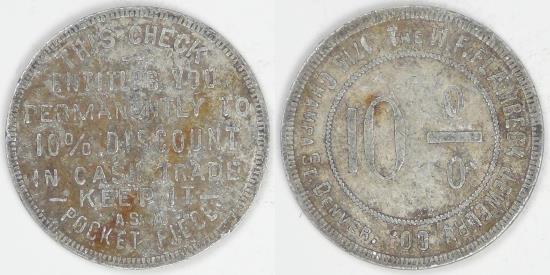The W.F. Plambeck Jewelry Co., Denver, CO, 10% Trade Token, VF
