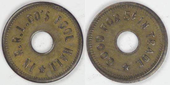 IN R.R.L. Co’s Pool Hall, Westwood, California, Good For 5¢ in Trade Token, AU