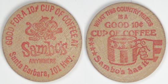 Sambo’s, Santa Barbara, CA, Good For 10¢ Cup of Coffee Wooden Nickel