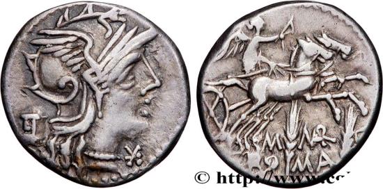 MARCIA Denier 134 AC. Rome silver Obverse : Anépigraphe Tête de Rome à droite, coiffée dun casque ailé ; derrière la tête, un modius ; sous le cou, marque de valeur (XVI) Reverse : M-(MAR)-C// RO-MA Victoire dans un bige galopant à droite, tenant une couronne et les rênes ; sous les chevaux, deux épis de blé Commentary : Monnaie centrée. Joli portrait de Rome. Revers agréable. Patine grise
