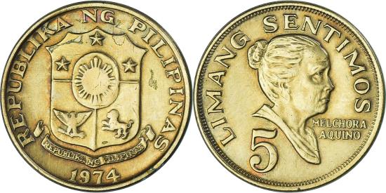| | Coin, Philippines, 5 Sentimos, 1974, , Brass, KM:197 | | | Shield above banner, Head right | | FEATURES |