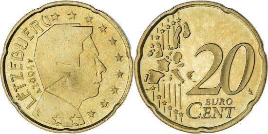 | | Luxembourg, 20 Euro Cent, 2004, Utrecht, , Brass, KM:79 | | | Grand Duke's portrait, Value and map, Yvette Gastauer-Claire | | FEATURES |