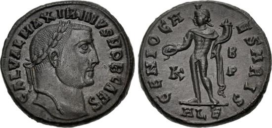 ROMAN EMPIRE: Maximinus II, as Caesar, AD 305-309, AE Follis (23.5mm, 6.63g, 6h), Alexandria mint, 2nd officina, struck c. late AD 308-310. Obverse: Laureate head right. Reverse: Genius standing left, holding patera and cornucopia; K|B/P//ALE. Beautiful detail. Attractive dark brown patina with traces of green and red. RIC VI 99a. Ex Jack A Frazer Collection. Ex CNG inventory, # 903400, 1993; Ex CNG Auction 468, Lot 524.