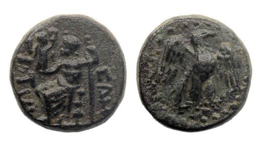 A very beautyful bronze coin, probably Macedonia or Seleukid, we're not certain. With a figure seated on the throne, probably Zeus and a fierce eagle on the reverse. Weight: 3.48 grams. Condition: Choice EF, unusually nice and perfectly centered, black patina. |