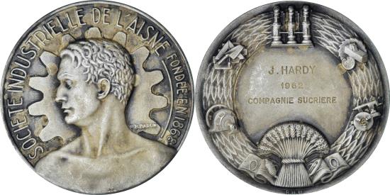 | | France, Medal, French Fifth Republic, Société industrielle et commerciale de | | | Industrial and Commercial Society of Aisne, Medal, BARON, 59mm, Obverse: INDUSTRIAL AND COMMERCIAL SOCIETY OF AISNE FOUNDED IN 1868. Man in front with the head to the left. Behind him, a cog. Reverse: Crown composed of a sheaf of wheat and machines. In the middle: B.POURRIER / 1969 / ETS HAZEMEYER. Smooth edge hallmarked with a cornucopia and 1970 BRONZE inscriptions. (Medals>French>XXth Century) | | FEATURES |