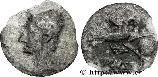 AUGUSTUS Denier 19-18 AC. Gaule, Nîmes R3 silver Obverse : Anépigraphe Tête nue dAuguste à gauche (O°1) Reverse : AVGVSTVS à lexergue Capricorne à droite, une corne dabondance sur le dos, un globe entre les pattes Commentary : Monnaie sur un flan irrégulier, centré. Revers agréable. Usure importante. Patine grise